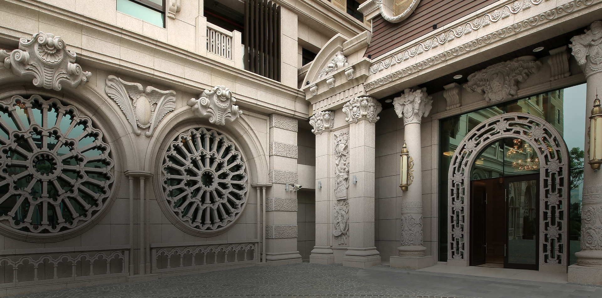 建築一旦提昇至藝術境界,不再有任何極限,「君邑韋瓦第」不惜成本的重現巴洛克雕刻藝術精隨。