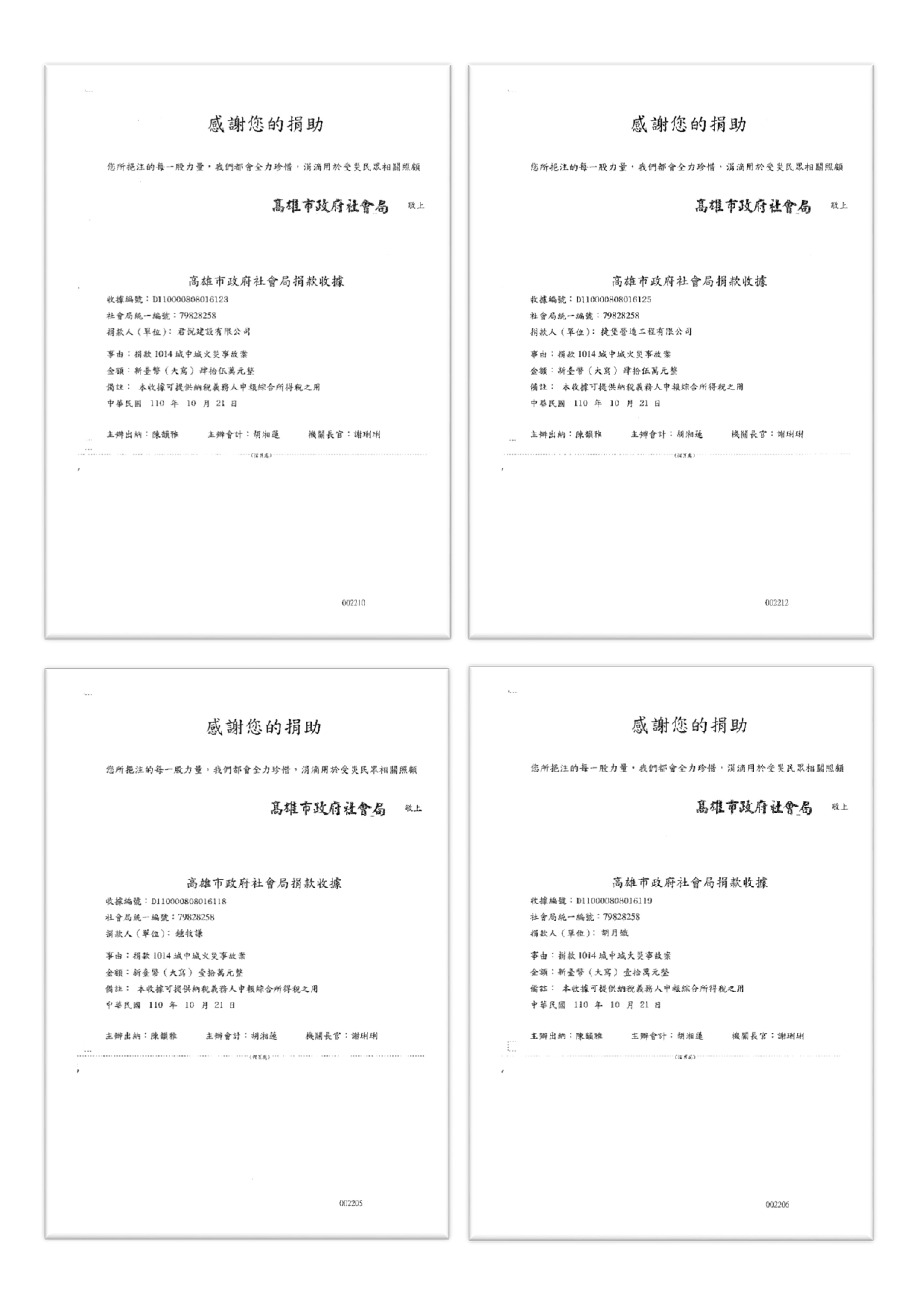 高雄城中城大樓14日凌晨發生高雄26年來最嚴重的火災事故,面對此次突發的重大傷亡事件,君邑建築捐款110萬元至高雄市政府社會局專戶,盼能援助受災戶。此筆捐款將用於協助傷患後續醫療、生活與社會重建相關費用,並提供罹難者家屬經濟支持。
