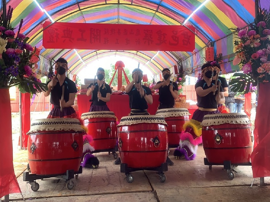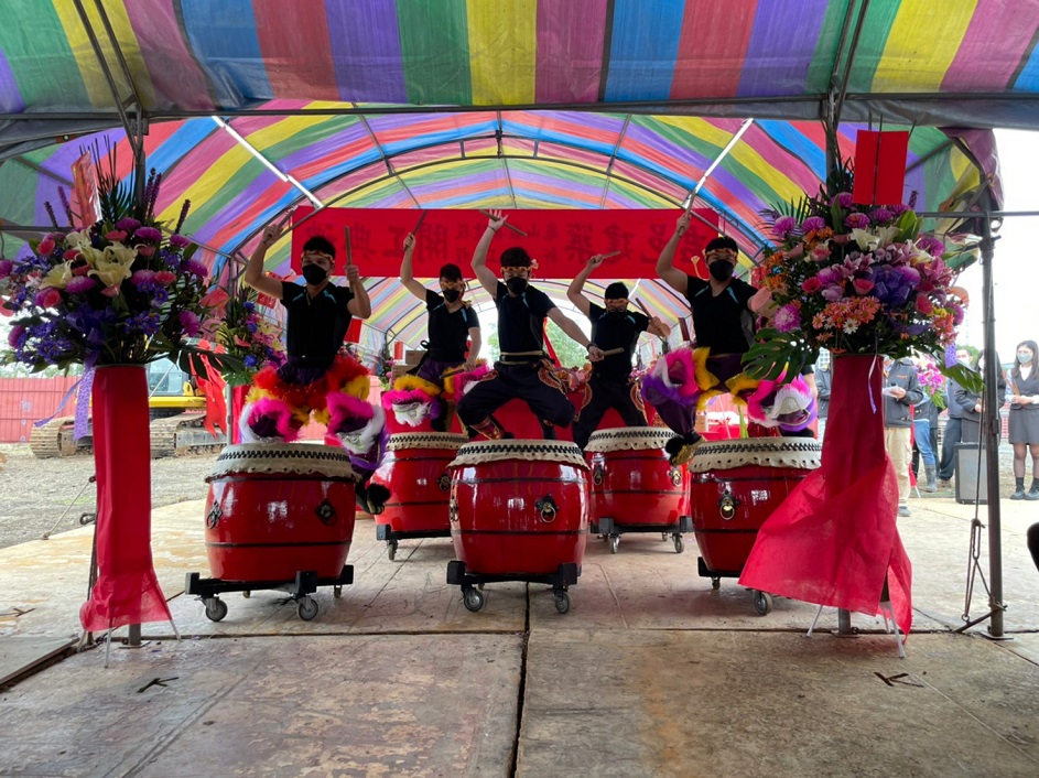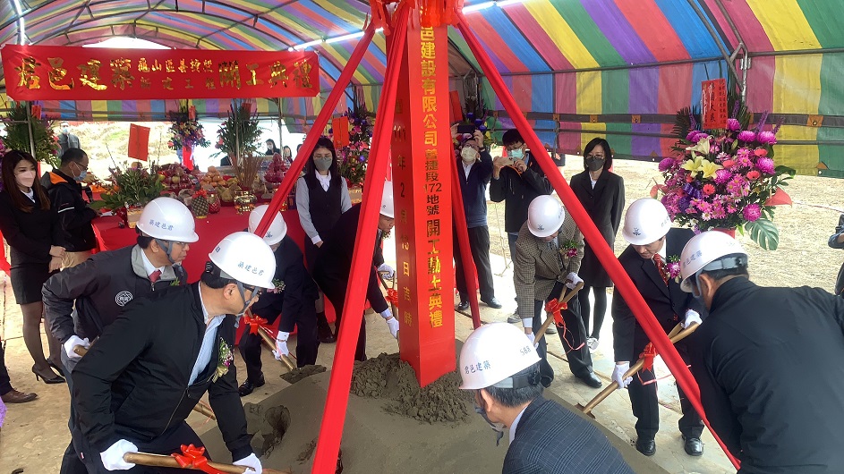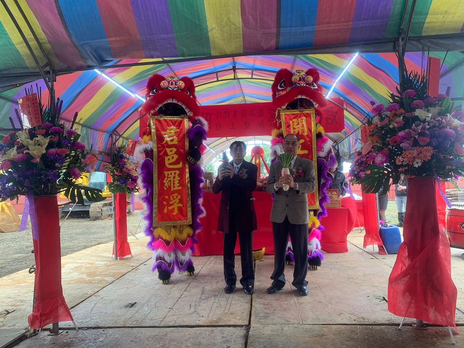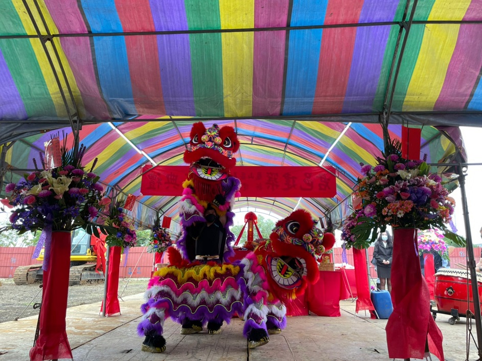 今天董事長與副董事長於活動開場時,共同接受祥獅獻瑞,並手舉好彩頭及鳳梨,象徵祈求工程順利。隨後,董事長於開工祝禱時,虔誠獻花、獻菓、獻酒、獻餚及獻財帛,並提起金鏟,起鍬三鏟,完成動土儀式。董事長也在金鏟上簽名,並與大家合影留念。