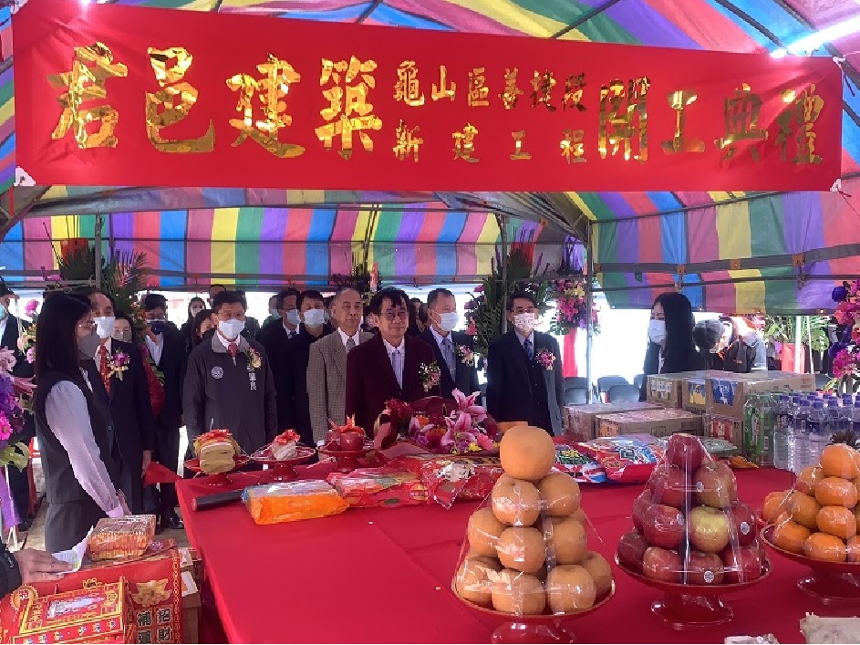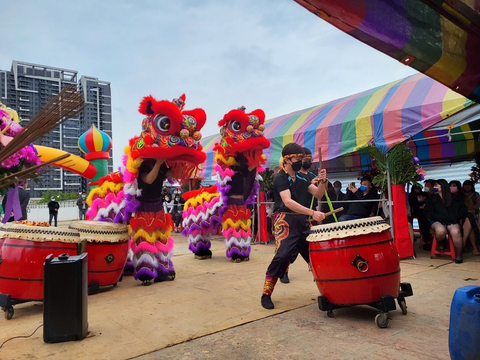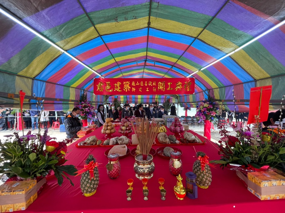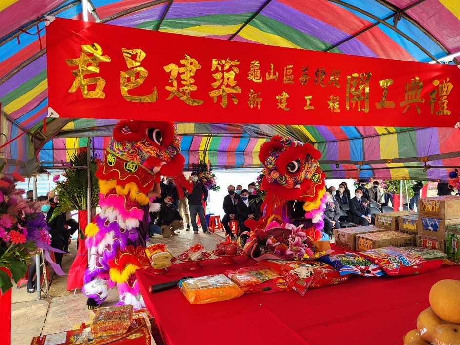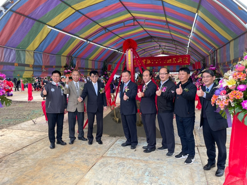 今天董事長與副董事長於活動開場時,共同接受祥獅獻瑞,並手舉好彩頭及鳳梨,象徵祈求工程順利。隨後,董事長於開工祝禱時,虔誠獻花、獻菓、獻酒、獻餚及獻財帛,並提起金鏟,起鍬三鏟,完成動土儀式。董事長也在金鏟上簽名,並與大家合影留念。
